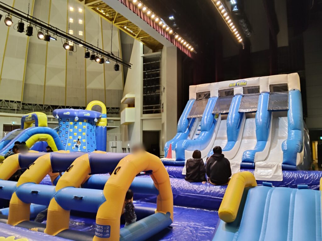 ふわふわの障害物コースを走り抜け、最後は滑り台を滑り降りてくるようなアトラクションのようでした!